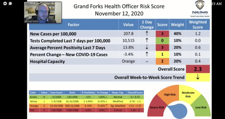 We’re in the orange. (20) In a state where there are less than 10 people per square mile, it seems hard to believe that we’re in the “High-Risk” category for a viral illness that is believed to spread from person to person. As far as social distancing goes, in North Dakota on average, we’d all need to move, a lot, to get within 6 feet of someone. So how can we be “High-Risk”? Well, that is simply a function of the math.