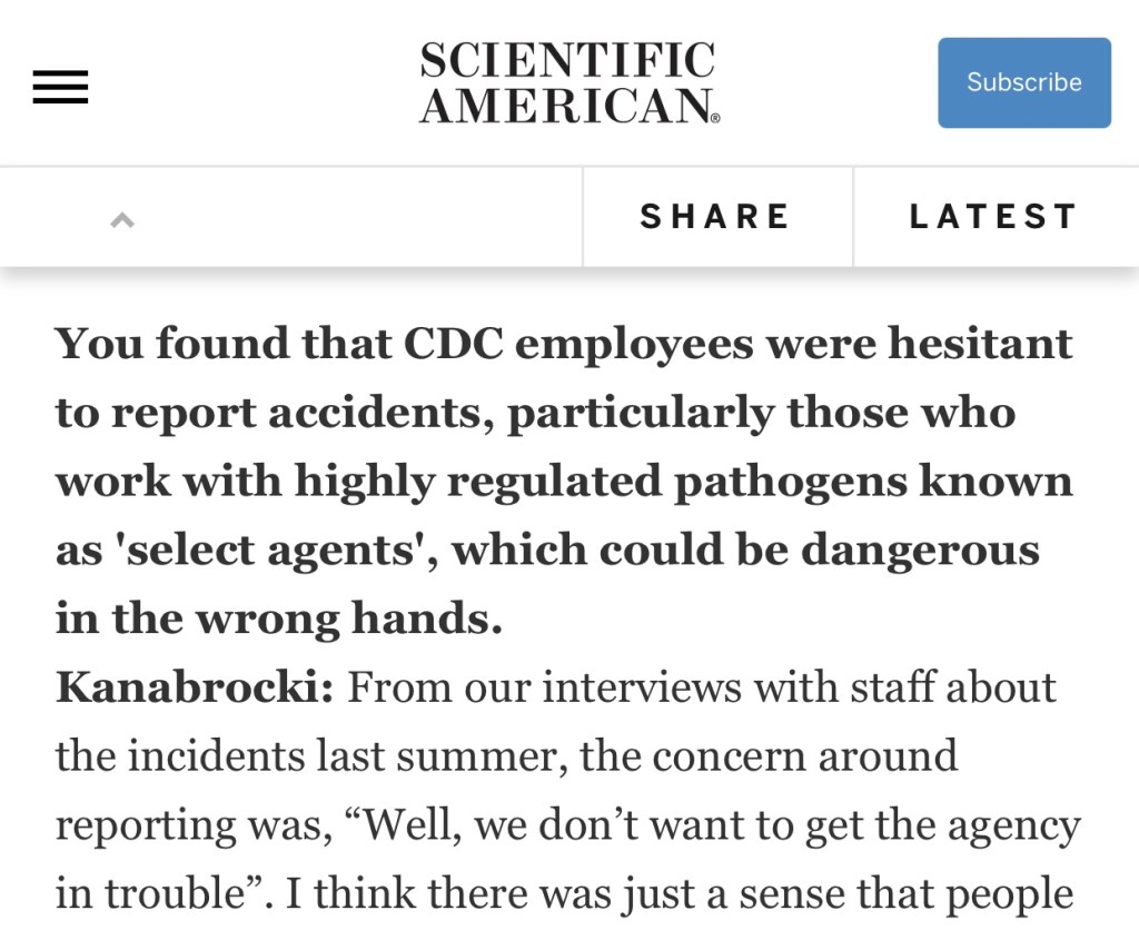 Oversight of biological research labs is fragmented, often secretive and largely self-policing, the investigation found. And even when research facilities commit the most egregious safety or security breaches — as more than 100 labs have — federal regulators keep their names secret.”
