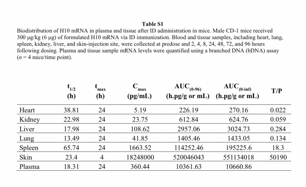 The mice were given 14 days to have an immune response to the “lethal dose.” Then, three were euthanized. After euthanasia, the three mRNA vaccinated mice were sliced and diced for study. The tissues were then examined for presence of the “modified mRNA-based influenza A vaccine”. It was found in every single bodily tissue examined. From brains to testes, the mRNA (which is supposed to quickly degrade) was present, more than 80 days after injection AND it had spread all over the bodies of the three mice.